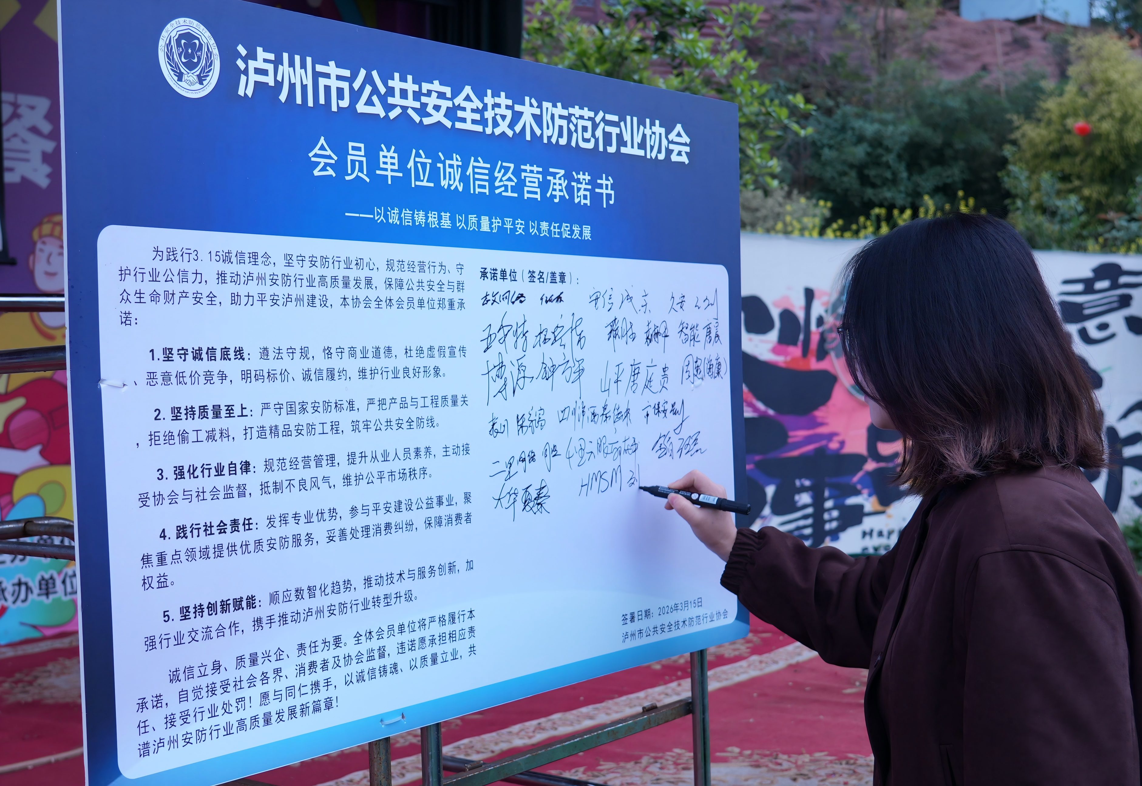 宣贯会现场举行了企业诚信承诺签名仪式,协会会员单位代表依次在诚信承诺墙上郑重签名并进行诚信宣誓。一笔一画签下的不仅是名字,更是安防企业对社会、对客户的郑重承诺,充分展现了泸州安防行业诚信自律、规范发展的坚定决心。
