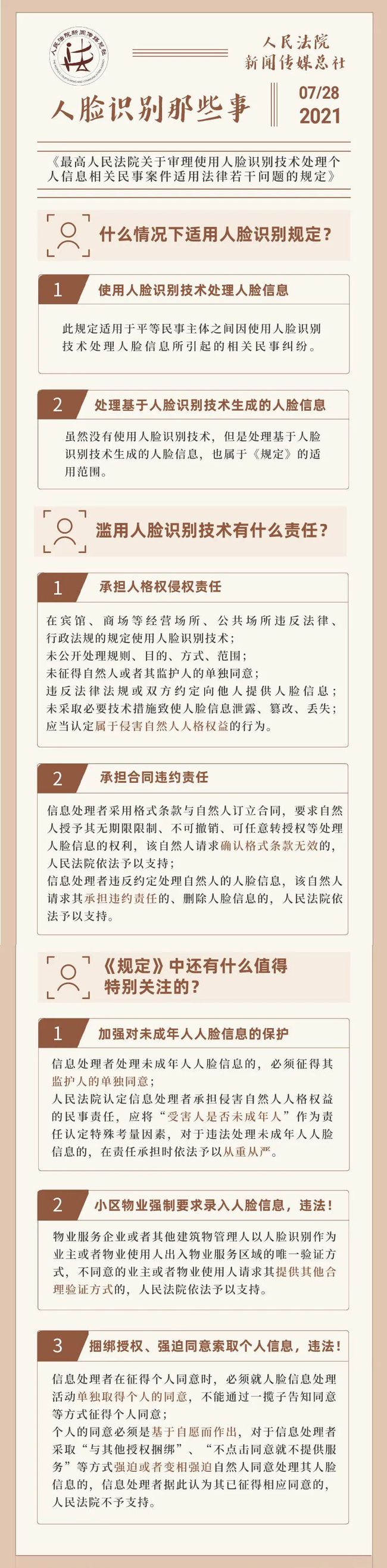 《最高人民法院关于审理使用人脸识别技术处理个人信息相关民事案件适用法律若干问题的规定》,于2021年7月28日正式发布。