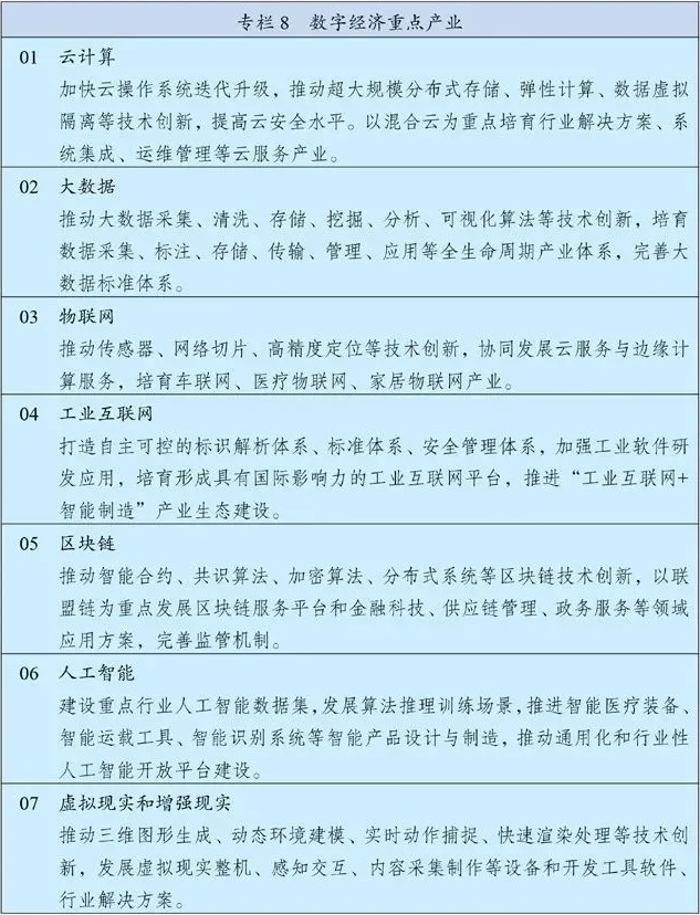 培育壮大人工智能、大数据、区块链、云计算、网络安全等新兴数字产业,提升通信设备、核心电子元器件、关键软件等产业水平。构建基于5G的应用场景和产业生态,在智能交通、智慧物流、智慧能源、智慧医疗等重点领域开展试点示范。鼓励企业开放搜索、电商、社交等数据,发展第三方大数据服务产业。促进共享经济、平台经济健康发展。