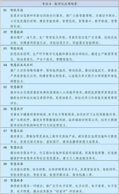 实施“上云用数赋智”行动,推动数据赋能全产业链协同转型。在重点行业和区域建设若干国际水准的工业互联网平台和数字化转型促进中心,深化研发设计、生产制造、经营管理、市场服务等环节的数字化应用,培育发展个性定制、柔性制造等新模式,加快产业园区数字化改造。深入推进服务业数字化转型,培育众包设计、智慧物流、新零售等新增长点。加快发展智慧农业,推进农业生产经营和管理服务数字化改造。