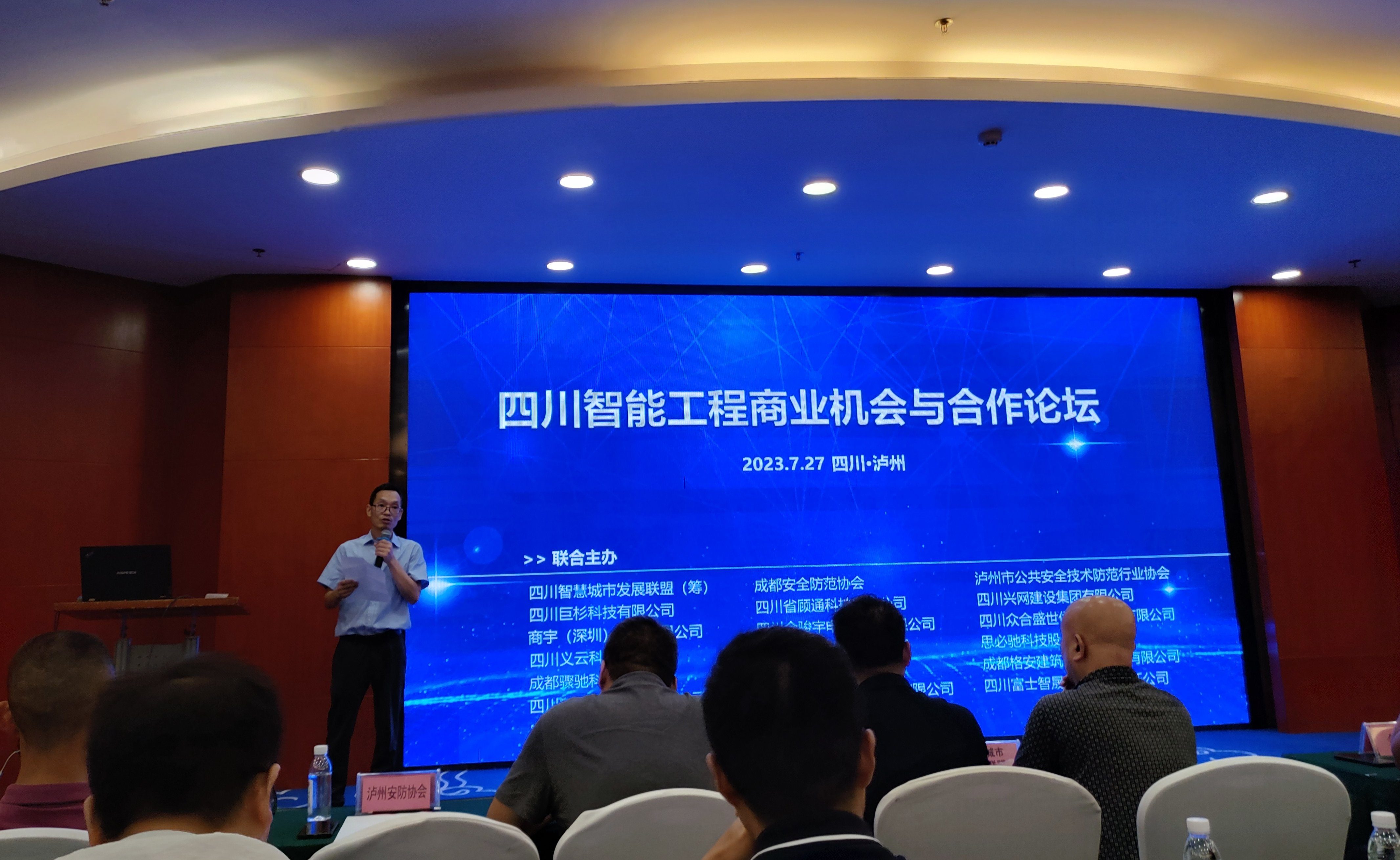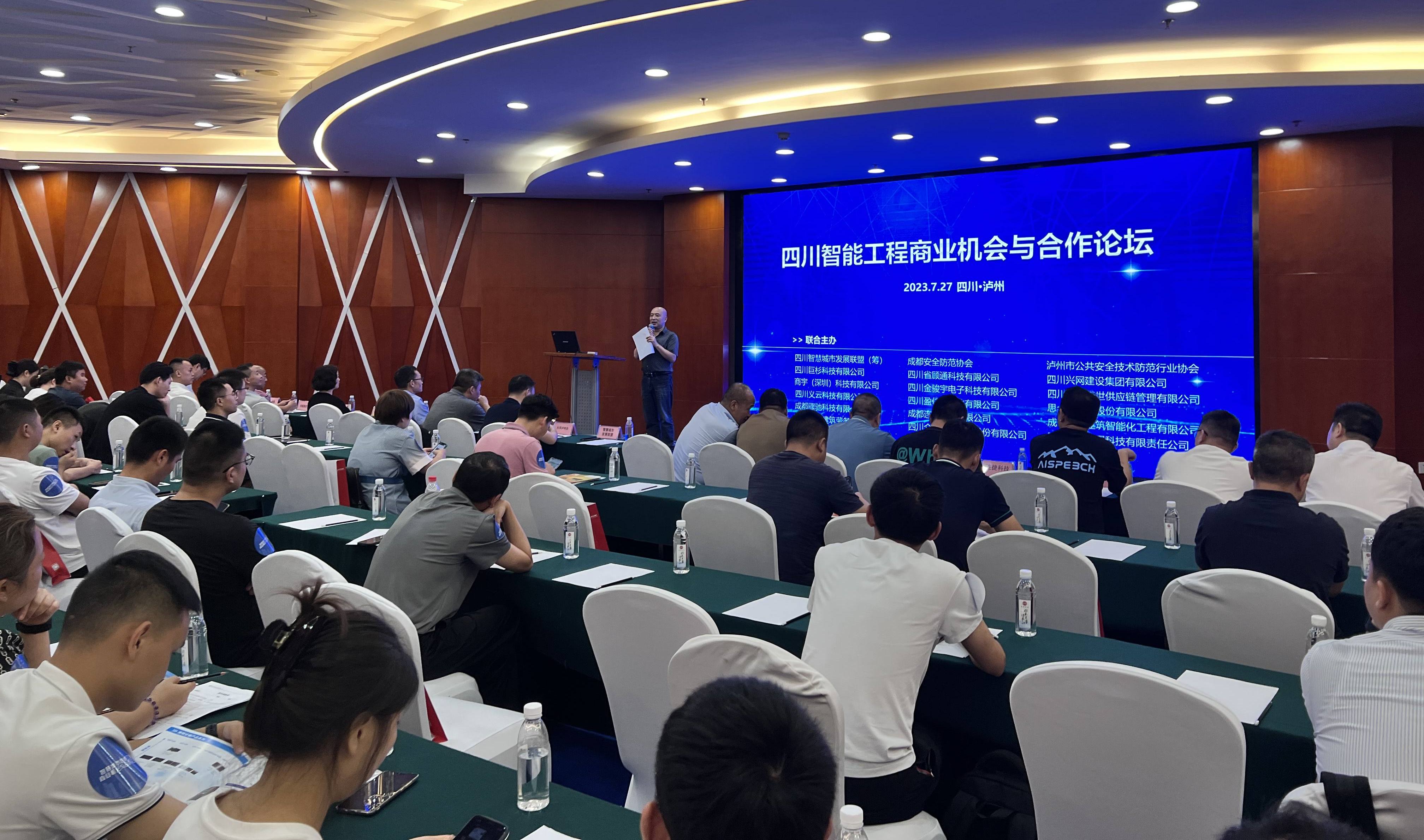 7月27日下午,由四川智慧城市发展联盟(筹)主办的四川智能工程商业机会与合作论坛(泸州站)在泸州市南苑宾馆月桂厅隆重召开,协会受邀参加了此次盛会。协会秘书长吴晖、王贵有、理事钱东、杨桥绪和部分会员单位出席了本次论坛。同时还有来自成都安全防范协会的王永宁秘书长、泸州和成都的一百多位厂商、工程商、集成商。